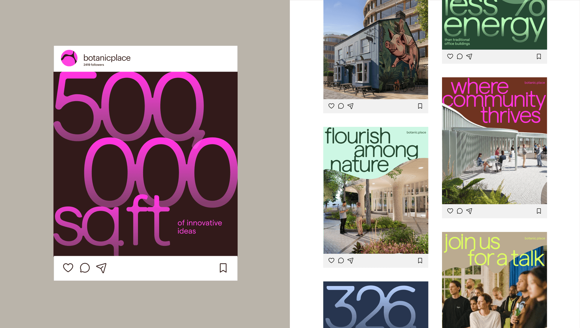 Botanic Place is a next-generation workplace development in Cambridge, designed to support innovation, wellbeing, and collaboration within the city’s globally recognised science and technology ecosystem. Positioned at the intersection of research, culture, and community, the development brings together contemporary architecture, public space, and nature to create a more human-centred working environment. Botanic Place is designed to support the people and ideas shaping the future of science and technology. The identity reflects this balance between innovation and calm. A restrained, confident visual language draws inspiration from natural systems, creating a brand that feels both contemporary and enduring.